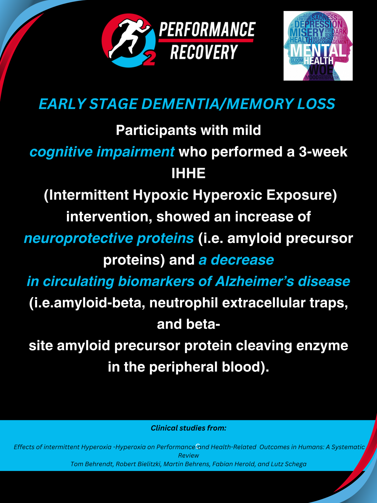 - Alzheimer’s Disease: IHHT has been shown to improve cognitive function and levels of circulating Alzheimer’s biomarkers in patients with mild cognitive decline, suggesting it may slow the disease’s progression (Serebrovska et al., 2019).